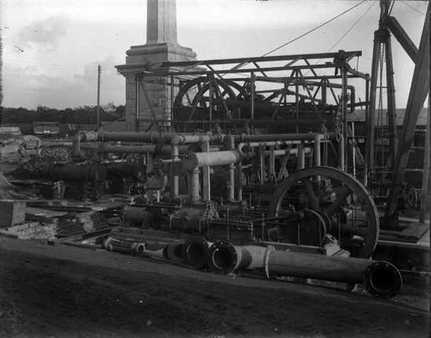 When it was in use there was a large chimney and a corrugated iron building, this housed two large steam engines with 8 or 9 foot diameter flywheels. It pumped water from an artesian well, through the Thermopylae Pass to the waterworks in Bidston Road.