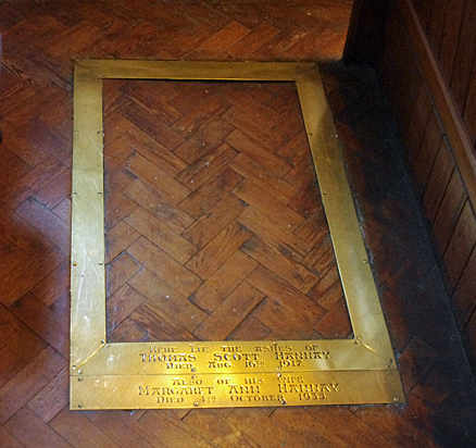 Thomas Hannay died in 1917, his ashes, together with those of his wife who died in 1935, lie under a brass plaque on the floor opposite the entrance. A memorial plaque is mounted on the wall above them.